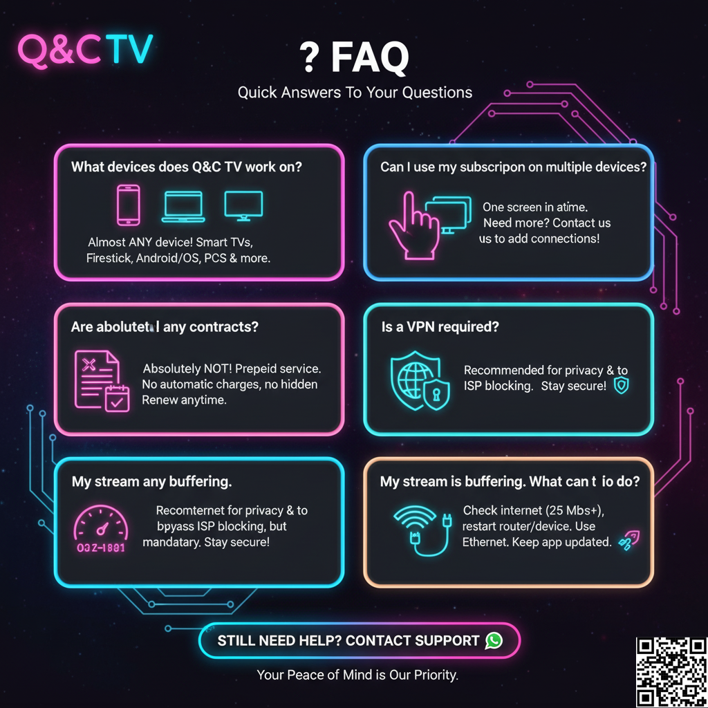 Absolutely not. ✍️ Q&C TV is a prepaid service. You pay for the period you want, and when it expires, you can choose to renew. No automatic charges, no hidden fees.